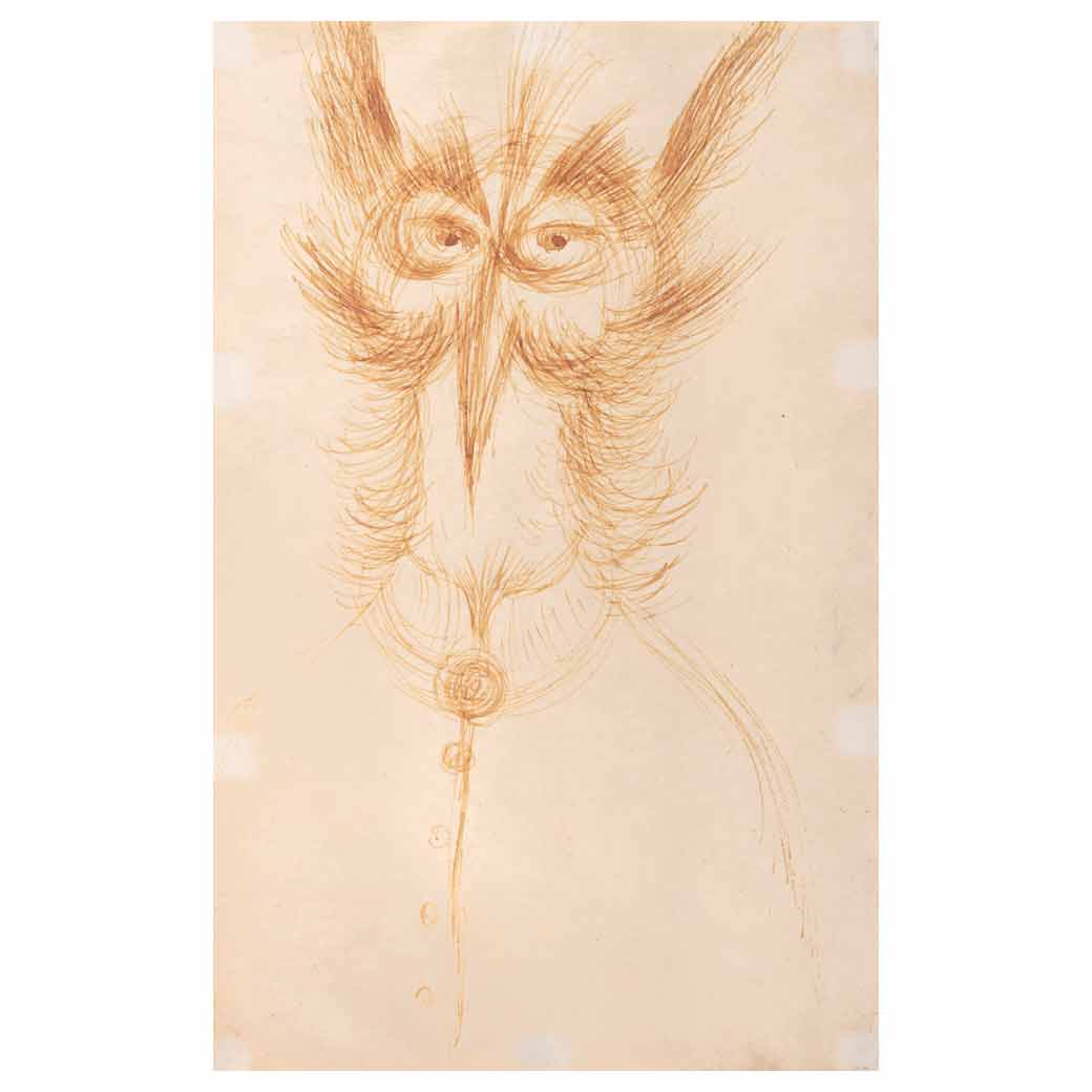 Subasta 1134, Lote # 54 REMEDIOS VARO (Anglès [Gerona], España, 1908 - Ciudad de México, 1963) Personaje pájaro, 1945 Sin firma Tinta sobre papel Agradecemos al Dr. Salomon Grimberg por la revisión de esta obra, septiembre de 2023. Procedencia: perteneció a la colección de Ignacia Uranga Bergareche y Rodrigo Varo Uranga. Publicada en: OVALLE, Ricardo, GRUEN, Walter et al.Remedios Varo. Catálogo Razonado. México, Ediciones Era, 2008, pág. 311. Presenta detalles de conservación. 21.5 x 14 cm Estimado $250,000-350,000