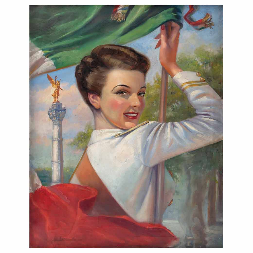 JOSÉ BRIBIESCA JR. (México) Abanderada en desfile Firmado Óleo sobre tela Presenta desprendimiento de capa pictórica, craqueladuras y restauración. 75 x 60 cm Estimado $70,000-90,000