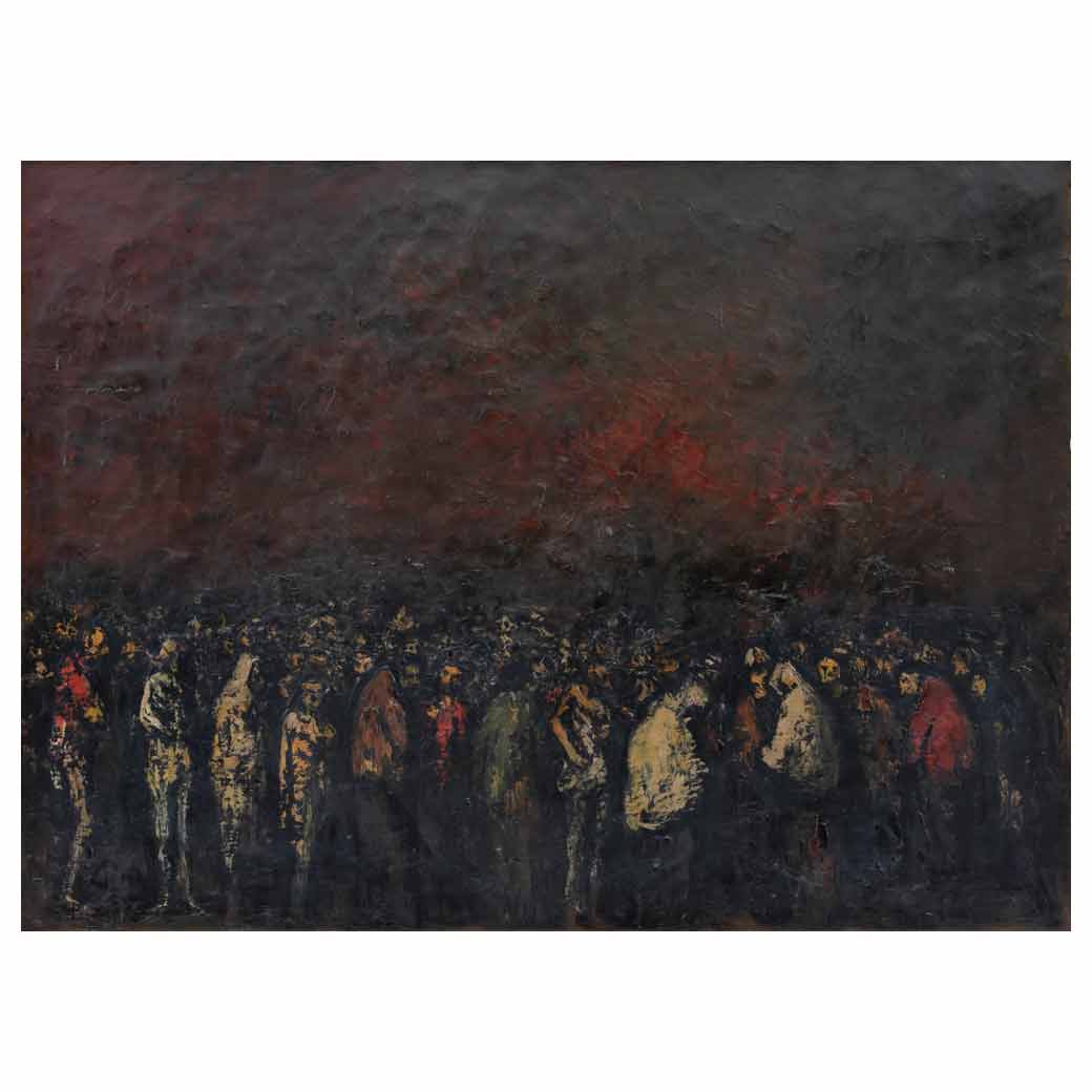 Subasta 1134, Lote # 70 ANTONIO RODRÍGUEZ LUNA (Córdoba, España, 1910 - Córdoba, España, 1985) Multitud Firmado y fechado 58 Óleo sobre tela Con etiqueta de Museo Nacional de Arte Moderno de la Ciudad de México. Presenta detalles de conservación y craqueladuras. Antonio Rodríguez Luna llegó a México en 1939 junto con un contingente de exiliados entre los que se encontraban intelectuales, artistas y científicos españoles tras el desenlace de la Guerra Civil Española y el inicio de la Segunda Guerra Mundial. Su estilo nos remite a una mezcla de influencias provenientes del surrealismo, expresionismo y realismo principalmente. Sin embargo, su lenguaje no siempre fue el mismo, a su llegada a México optó por recurrir a la temática indigenista para estar a tono con la Escuela Mexicana, pero pronto continuó con la búsqueda de elementos más personales. Otro gran peso que se aprecia en su obra parte de una sólida formación clásica con un extenso conocimiento de la tradición figurativa que le llevó a dominar, de manera magistral, el dibujo de líneas firmes y composiciones sólidas con colores negros y tonos sombríos que bien recuerdan a los maestros barrocos de su tierra natal, como podemos referenciar a Francisco Zurbarán. Fuentes consultadas: REJANO, Juan. Antonio Rodríguez Luna. México. Universidad Nacional Autónoma de México, 1971, pág. 14 y CABAÑAS BRAVO, Miguel. Pinceladas. Dos raíces, dos tierras, dos esperanzas. México. Grupo Financiero BX+, 2014, pp. 36-48. 70 x 96 cm Estimado $200,000-300,000