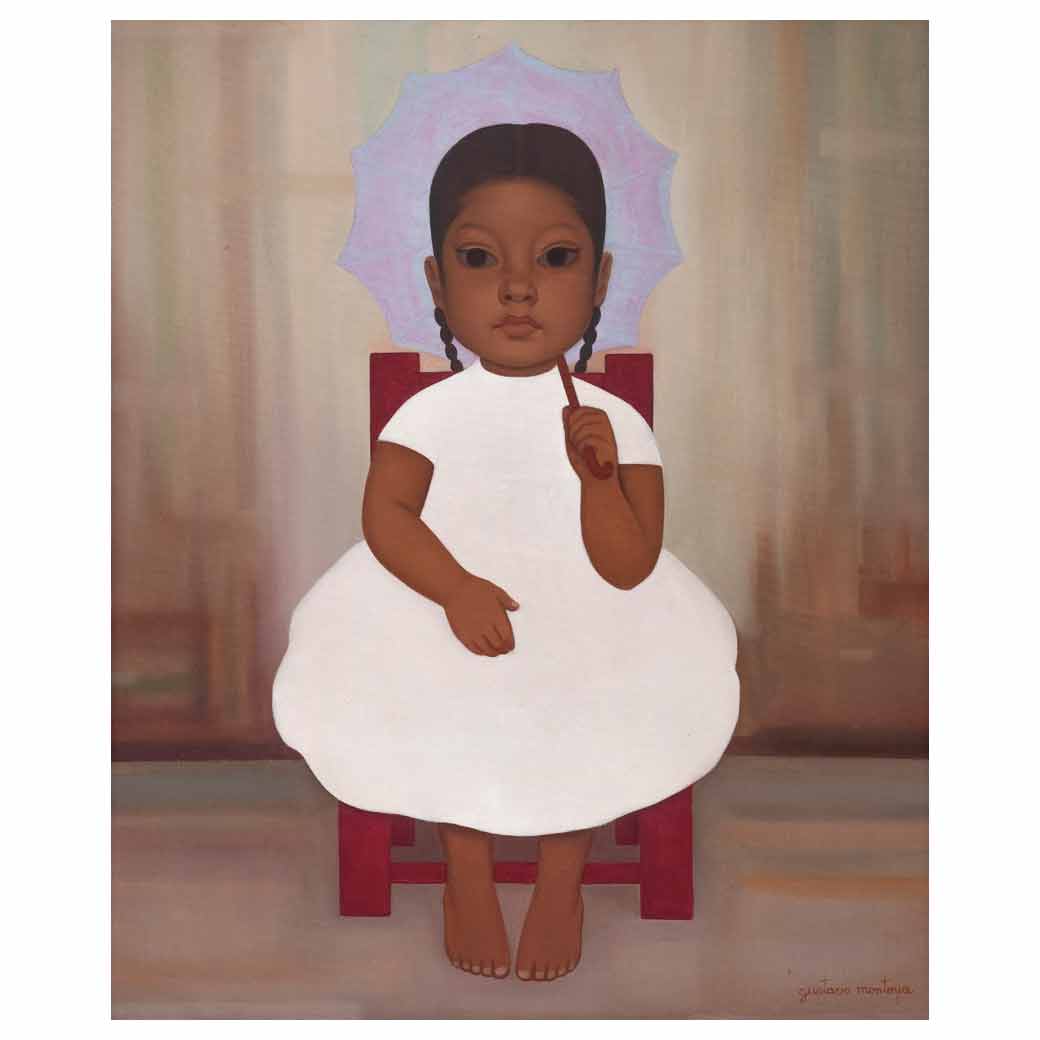 Subasta 1134, Lote # 9 GUSTAVO MONTOYA (Ciudad de México, 1905 - Ciudad de México, 2003) Niña en rosa, ca. 1962, de la serie Niños Mexicanos Firmado Óleo sobre tela Procedencia: adquirido en Galería Hagerman Baños; México. Perteneciente a la Escuela Mexicana de Pintura, Gustavo Montoya fue un artista que experimentó con nuevas técnicas y temáticas, así como con colores y formas que obedecían a su inspiración. Entre sus obras más conocidas destacan las naturalezas muertas y aquellas en las que se tienen como protagonistas a niños, piezas de gran demanda tanto en México como en el extranjero por la excelente narrativa y espontaneidad plástica dedicada a las tradiciones populares mexicanas. En la afamada serie de "Niños Mexicanos" observamos una delicada vinculación con la identidad nacional, en la que niños de tez morena y rasgos indígenas portan con orgullo elementos propios del imaginario mexicano. Fuentes consultadas: RULFO, Juan et al. Gustavo Montoya. México. Litógrafos unidos S. A., 1981, pp. 77-79 y LARA ELIZONDO, Lupina. Resumen. Pintores y pintura mexicana. México. Promoción de Arte Mexicano, año 4, No. 40, julio-agosto 1999, pp. 10-12. 54.5 x 44.5 cm Estimado $300,000-400,000