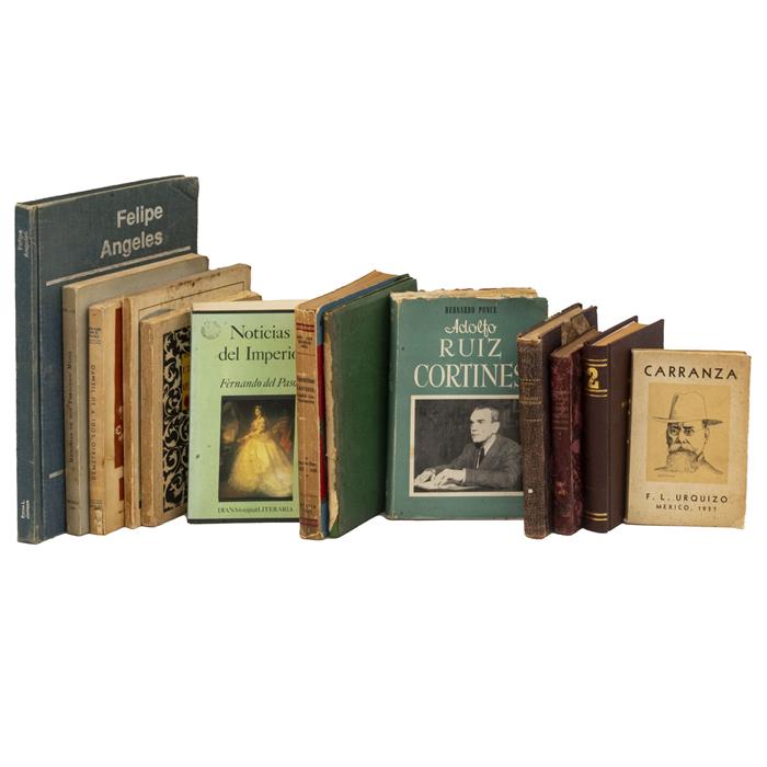 Subasta 1205T, Lote # 118 Libros sobre Historia de México. Títulos: -Frías Heriberto. Episodios Militares Mexicanos. México: Librería de la Vda. de Ch. Bouret, 1901. 289 p. + 1 h.; 277 p. + 1 h. Principales campañas, jornadas, batallas, combates, y actos heroicos que ilustran la historia del Ejército Nacional desde la Independencia hasta el triunfo definitivo de la República. Primera Parte Guerra de Independencia. 13 láminas intercaladas, dos mapas "Carta de la Nueva España, indicando la extensión del territorio donde se propagó la revolución desde 16 de Septiembre de 1810 hasta Marzo de 1811"; "Carta General de la Nueva España según estaba el año de 1813", a doble página. Ejemplar deteriorado, afectado por humedad. Pastas manchadas. Encuadernado en pasta dura. Segunda Parte Invasión Norteamericana. 15 láminas intercaladas. Dos croquis fuera de texto: "Croquis de la Batalla de la Angostura"; "Croquisde la Batalla de Padierna", a doble página, con detalles en color. Pastas nuevas. Encuadernado en pasta dura. Piezas: 2. -Rabasa, Emilio. La Evolución Histórica de México. México: Librería de la Vda. de Ch. Bouret, 1920. 349 p. Cajos quebrados. Pastas gastadas. -Amaya, Juan Gualberto. Venustiano Carranza Caudillo Constitucionalista. México: 1947. 499 p. Cajos quebrados. -Maytorena, José M. Algunas Verdades sobre el General Álvaro Obregón. Imprenta de "El Heraldo de México", 1920. 76 p. Con algunos recortes de periodico, sin lomo. -Mellado, Guillermo. Tres Etapas Políticas de Don Venustiano. Entre otros. Encuadernado en pasta dura y rústica. Total de piezas: 13. Estimado $2,000-2,500