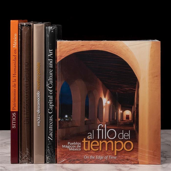 Libros sobre Pueblos Mágicos, Sitios y Paisajes de México. Títulos: -Un México con Destino. -Sitios Patrimonio de la Humanidad en México. -México Desconocido, nuestro paisaje. -Zacatecas. Capital of Culture and Art. -Al Filo del Tiempo. Ejemplares nuevos. Encuadernados en pasta dura y rústica. Total de piezas: 5. Estimado $1,000-1,500