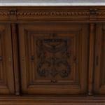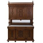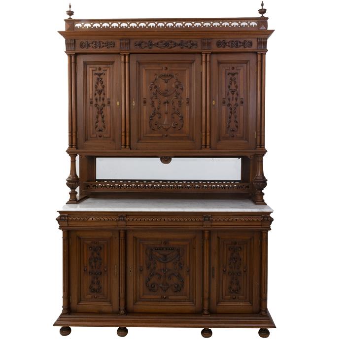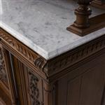 Elaborado a dos cuerpos en madera, con repisa de mármol, y vano con vidrio biselado.