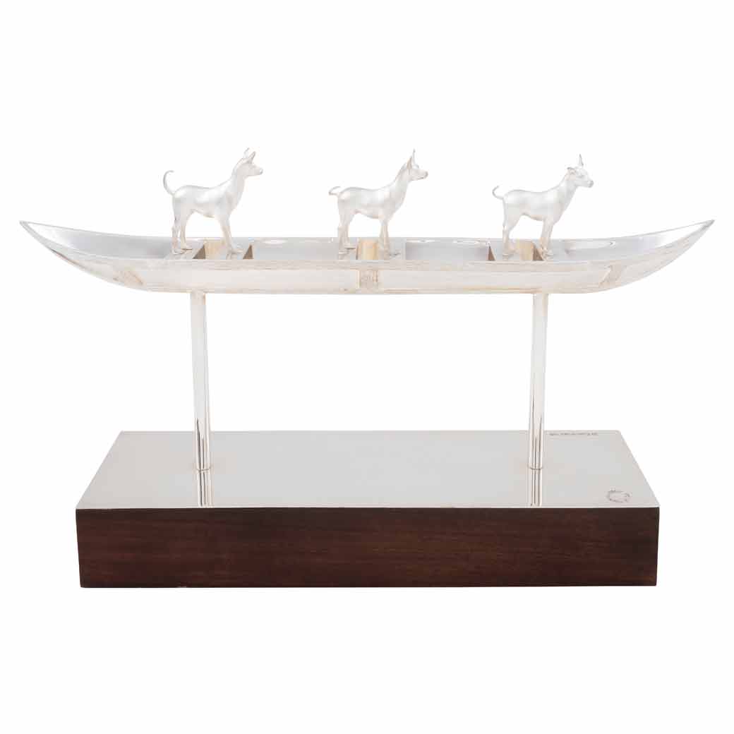 "Tríada, como alude el título de la obra, en principio denota tres perros xoloitzcuintles en plata sobre una balsa esculpida con el mismo material e inspira la idea de que flota en el agua. El referente agua y alusión a la muerte, sin embargo, es evidente. Fray Diego Durán, cronista español del siglo dieciséis, narra que estos perros fueron representados en la mitología mexica con la función de acompañar a los difuntos hacia el Mictlán, el lugar al que se iba después de la muerte". Jorge Marín.