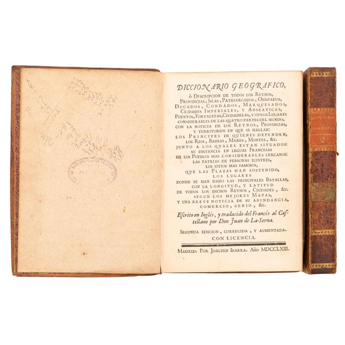 Subasta 0051L, Lote # 292 Serna, Juan de la (Traductor). Diccionario Geográfico o Descripción de Todos los Reynos, Provincias, Islas, Patriarcados, Obispados, Ducados, Condados, Marquesados, Ciudades Imperiales y Anseaticas. Madrid: Por Joachin Ibarra, 1763. 8o. marquilla, 10 h. + 405 p.; 1 h. + 378 p. Tomos I y II. Puertos, Fortalezas, Ciudadelas, y otros Lugares considerables de las quatro partes del Mundo, con la noticia de los Reynos, Provincias, y Territorios en que se hallan: los Príncipes de quienes dependen, los Ríos, Bahías, Mares, Montes, &c. junto a los quales están situados: su distancia en Leguas Francesas de los Pueblos más considerables cercanos: las patrias de Personas Ilustres, los sitios más famosos, que las Plazas han sostenido, los lugares donde se han dado las principales Batallas, con la Longitud y Latitud de todos los dichos Reynos, Ciudades, &c. según los mejores Mapas, y una breve noticia de su Abundancia, Comercio, Genio, &c. Tomo I: A - F. Surco de polilla en margen interno. Tomo II: G - O. Encuadernados en pasta dura, en piel. Piezas: 2. Estimado $3,000-4,000