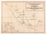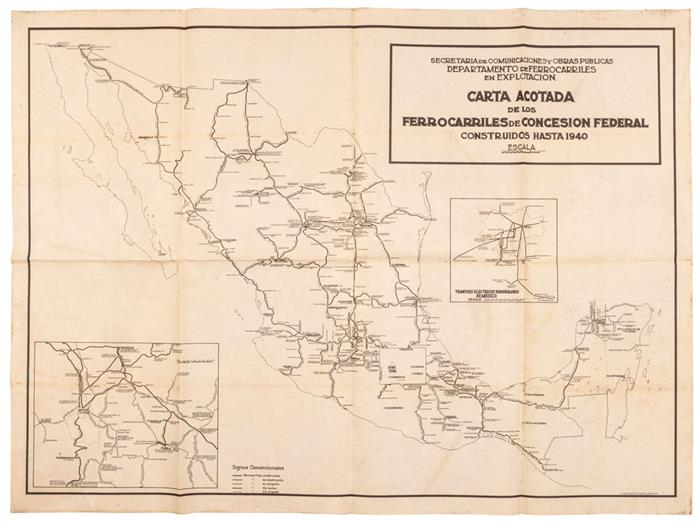 Secretaría de Comunicaciones y Obras Públicas, Departamento de Ferrocarriles en Explotación. Carta Acotada de los Ferrocarriles de Concesión Federal Construidos Hasta 1940. Impresión, 68 x 92 cm. Inserto: "Tranvías Eléctricos Suburbanos de México". Montado sobre tela. Estimado $2,000-3,000