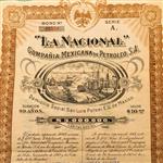 -"La Nacional". Compañía Mexicana de Petroleo. Bonos números 62045, 62250, 32242. Serie A. Valor $10.00. Capital Social $5.000.000. San Luis Potosi, 1916. Piezas: 3.