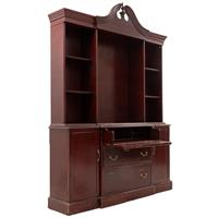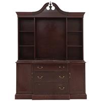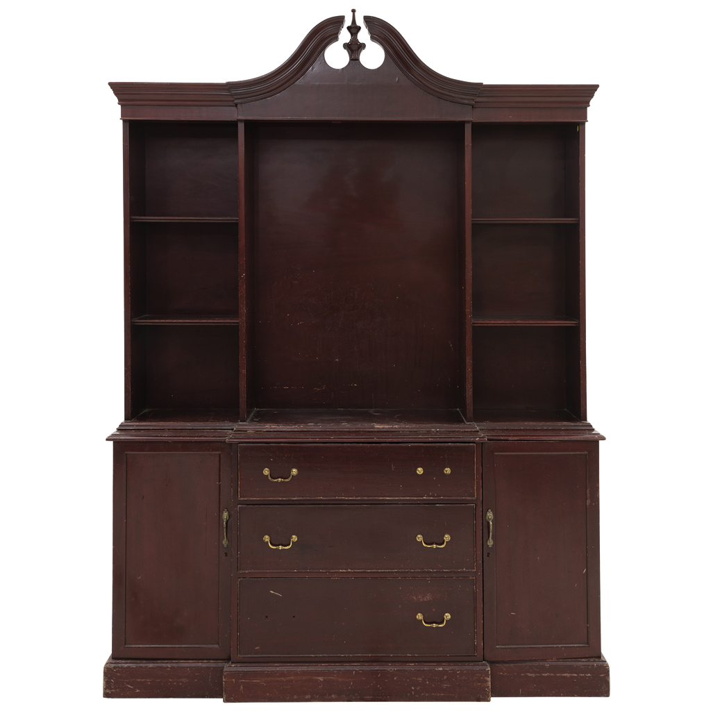 Cuenta con tres cajones y puertas abatibles con tiradores de metal y entrepaños