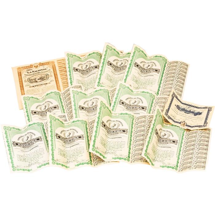 Subasta 1228T, Lote # 170 Lote de Acciones. Títulos: -Compañía de Petroleo "Inglesa y Anexas". Títulos números 31863 - 31869, 31872, 31873, 31875. Capital Social $6.000.000. México, 1916. Cupones completos. Piezas: 10. -Compañía Petrolifera Mexicana "La Carolina". No. 15234. Capital Social $1.000,000.00. México, 1914. -"La Nacional" Compañía Mexicana de Petroleo. Bono. no. 62247. Serie "A". Capital Social $5.000.000. Valor $10.00. San Luis Potosi, 1916. Cupones completos. Total de piezas: 12. Estimado $2,000-3,000