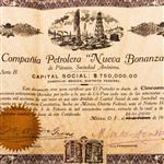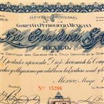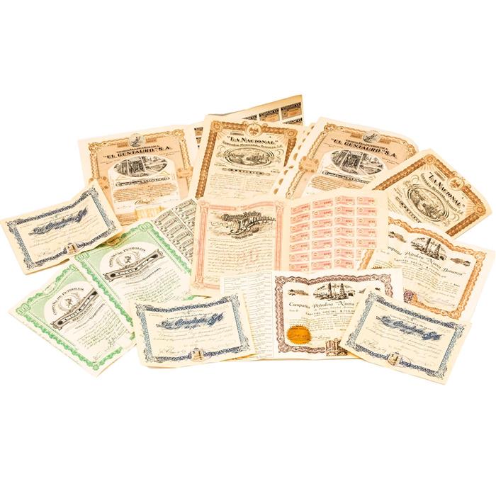 Subasta 1228T, Lote # 171 Lote de Acciones. Títulos: -Compañía Petrolifera Mexicana "La Carolina". Números 15205 - 15207. Capital Social $1.000,000.00. México, 1914. Piezas: 3. -Compañía Minera "La Meridional". Título no. 6742. Serie "F". 500 Acciones. Capital Social $400.000.00. Valor del Título $100.00. México, 1919. Cupones incompletos. -Compañía de Petroleo "Inglesa y Anexas". Títulos números, 31857, 31855. Capital Social $6.000.000. México, 1916. Cupones completos. Piezas: 2. -Compañía Petrolera "El Centauro". Serie "A". Títulos números 15231,15230. Valor de este título $50.00. México, 1916. Cupones completos. Piezas: 2. -"La Nacional". Compañía Mexicana de Petroleo. Bonos números 62041, 62042. Serie "A". Valor $10.00. Capital Social $5.000.000. San Luis Potosi, 1916. Cupones completos. Piezas: 2. -Compañía Petrolera "Nueva Bonanza2. Serie "D". Números 5602, 12760. Capital Social $750,000.00. 50 y 10 Acciones. México, 1914. México, 1914. Cupones completos. Piezas: 2. Total de piezas: 12. Estimado $2,000-3,000