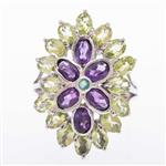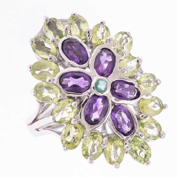 Subasta 1228T, Lote # 340 Anillo con esmeralda, amatista y peridotos en plata .925. Talla: 6 1/2. Peso: 5.5 g. Estimado $1,200-2,000