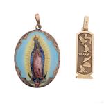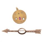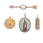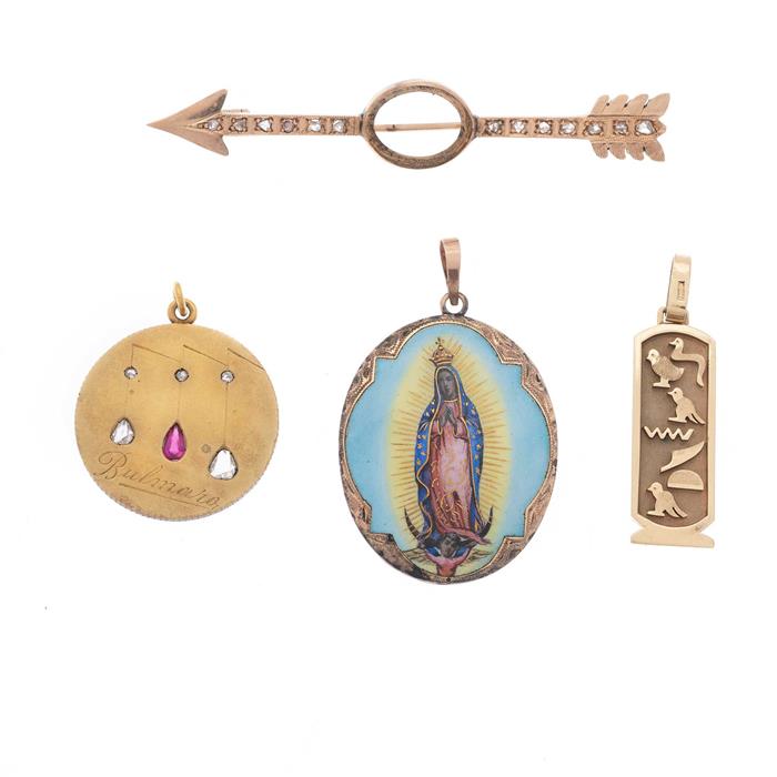 Dos pendientes, medalla y prendedor con diamantes en oro amarillo de 8 y 10k