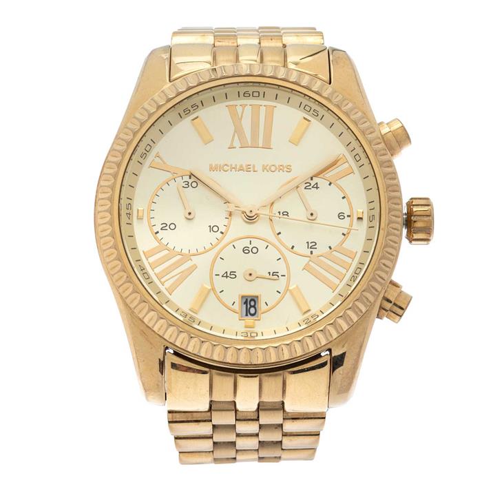 Reloj Michael Kors. Movimiento de cuarzo. Caja circular en acero dorado de 38 mm. Carátula color dorado con índices de barras y números romanos. Pulso en acero dorado.