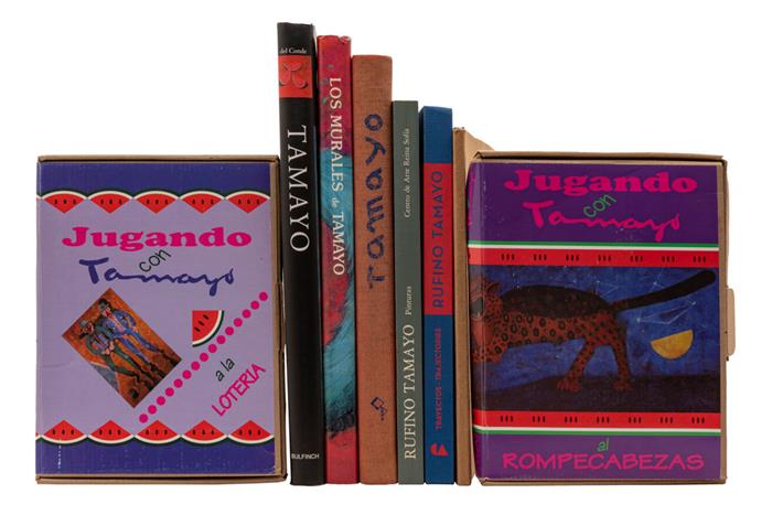 Varios formatos. Títulos: Jugando con Tamayo a la Lotería. Jugando con Tamayo al rompecabezas. Tamayo, Museo de Monterrey, enero-marzo 1986. Tamayo. Los Murales de Tamayo. Rufino Tamayo, Trayectos. Rufino Tamayo, Pinturas. Encuadernados en pasta dura (4) y rústica (2). Total de piezas: 8.