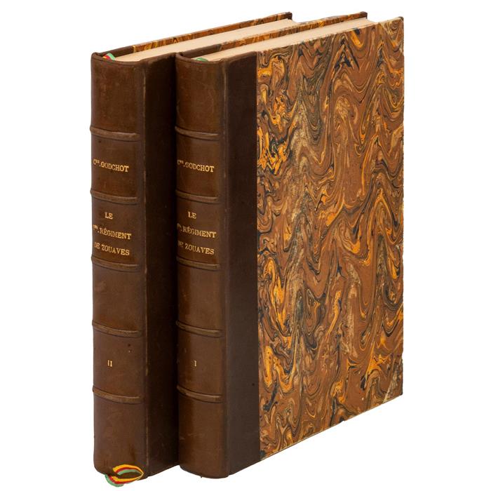 Subasta 1228T, Lote # 142 Godchot, Simón. Le 1er Régiment de Zouaves 1825 - 1895. Paris: Librairie Centrale des Beaux - Arts, 1898. XIX + 367; VII + 423 p. Illustrations de MM. E. Titeux, Krieger et Mucha. Tomos I - II. Tomo I: Cinco láminas (dos a color). Tomo II: Cinco láminas (dos a color). Algunas páginas con puntos de óxido, afectan poco texto. Encuadernados en pasta dura, lomo en piel. Piezas: 2. Con información de la participación del regimiento en México durante julio 1862 a febrero 1867 en Puebla, Convento de Santa Inés, San Juan de los Llanos, Zacapoaxtla, Guadalajara, Gasa, Colima, Ameca, Jiquilpan, Río Potrerillos, Valle San-Yago, entre otros. Estimado $1,500-4,000