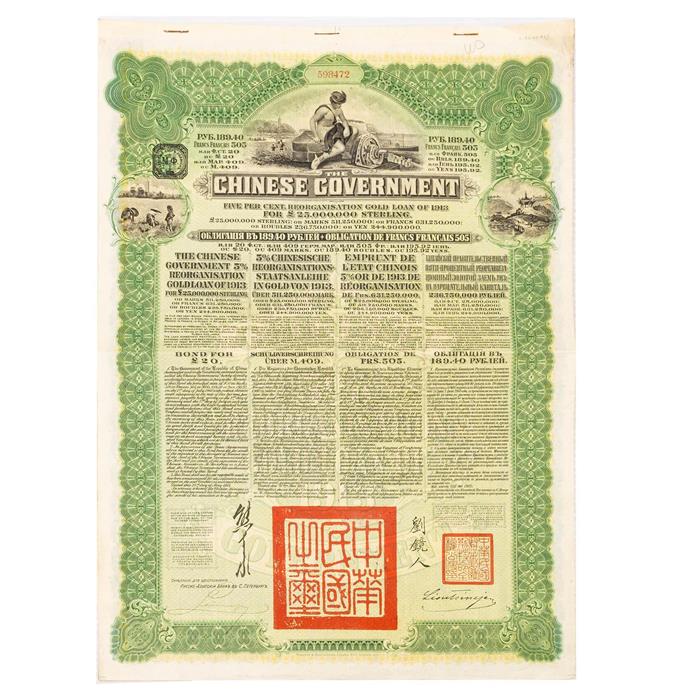 Bono al portador de 20 libras o 189,40 rublos emitido por el Russo-Asiatische Bank de San Petersburgo en 1913, para un préstamo con un interés del 5%.