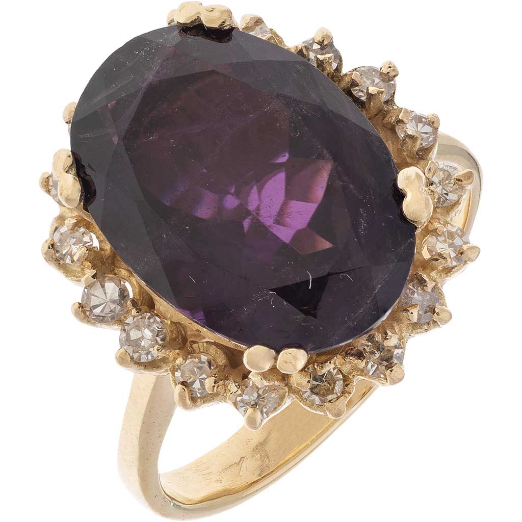 Subasta 1158, Lote # 140 ANILLO CON AMATISTA Y DIAMANTES EN ORO AMARILLO DE 14K Peso: 5.6 g. Talla: 7 3/4 1 Amatista corte oval ~4.50 ct Diamantes corte 8x8 ~0.35 ct Estimado $10,000-11,000