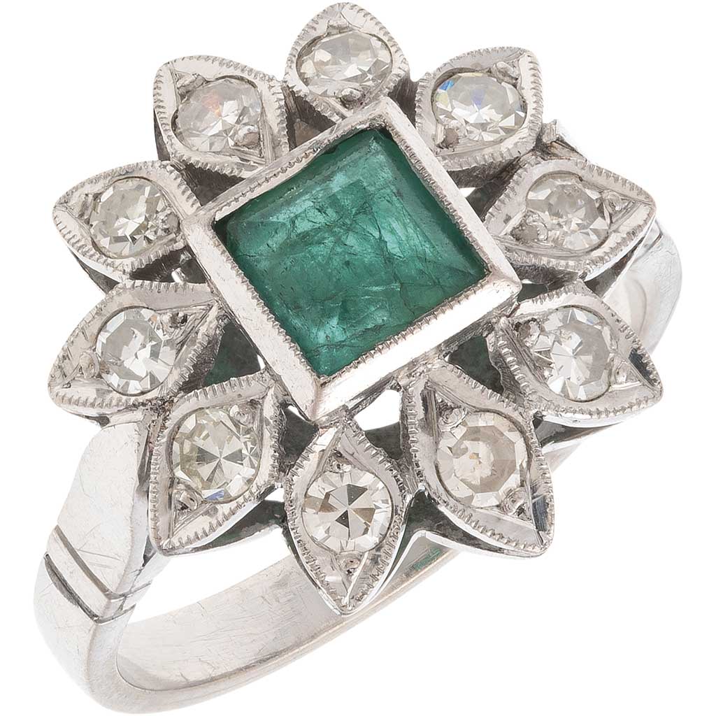 Subasta 1158, Lote # 200 ANILLO CON ESMERALDA Y DIAMANTES EN PLATA PALADIO Peso: 5.3 g. Talla: 8 3/4 1 Esmeralda corte cuadrado ~0.50 ct Diamantes corte 8x8 ~0.45 ct Estimado $6,000-7,000