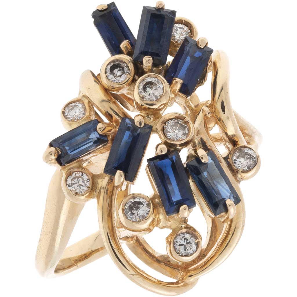 Subasta 1158, Lote # 130 ANILLO CON ZAFIROS Y DIAMANTES EN ORO AMARILLO DE 14K Peso: 5.4 g. Talla: 5 1/2 Zafiros corte baguette ~0.50 ct Diamantes corte brillante ~0.18 ct Estimado $11,000-12,000