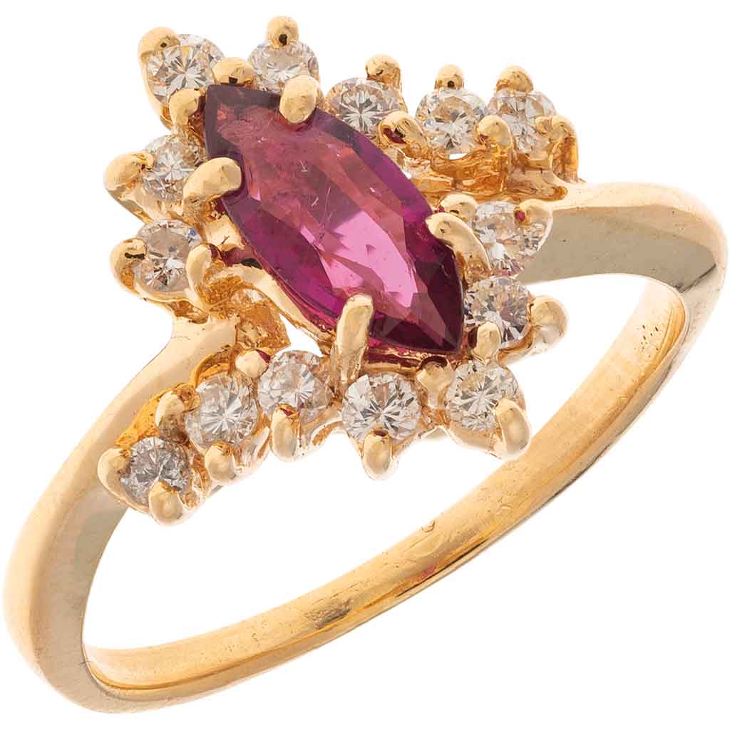 Subasta 1158, Lote # 131 ANILLO CON RUBÍ Y DIAMANTES EN ORO AMARILLO DE 14K Peso: 2.9 g. Talla: 6 1 Rubí corte marquise ~0.40 ct Diamantes corte brillante ~0.25 ct Estimado $7,000-8,000