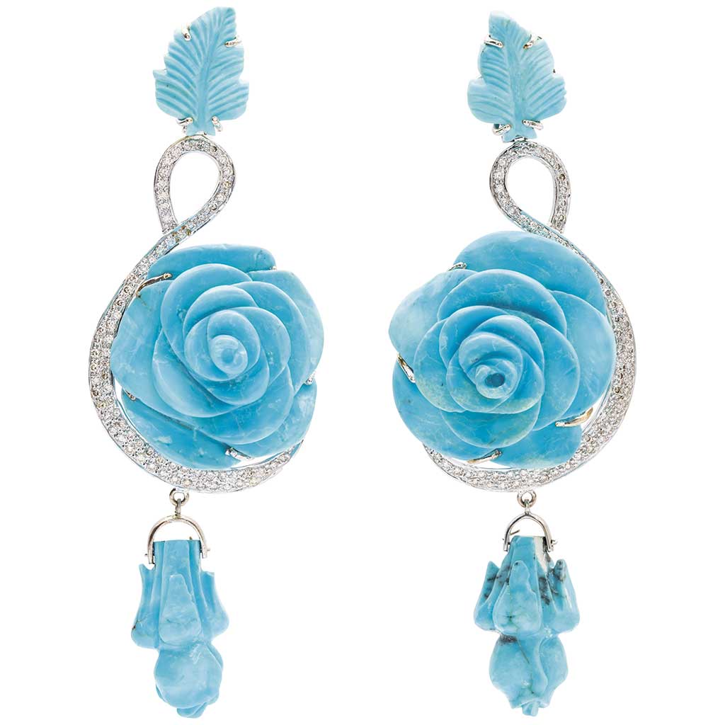 Subasta 1158, Lote # 175 PAR DE ARETES CON RESINA TALLADA Y DIAMANTES EN ORO BLANCO DE 18K Poste y contra. Peso: 32.4 g. Tamaño: 8.2 x 2.6 cm aprox. Diamantes corte brillante ~1.50 ct Estimado $15,000-20,000