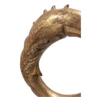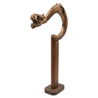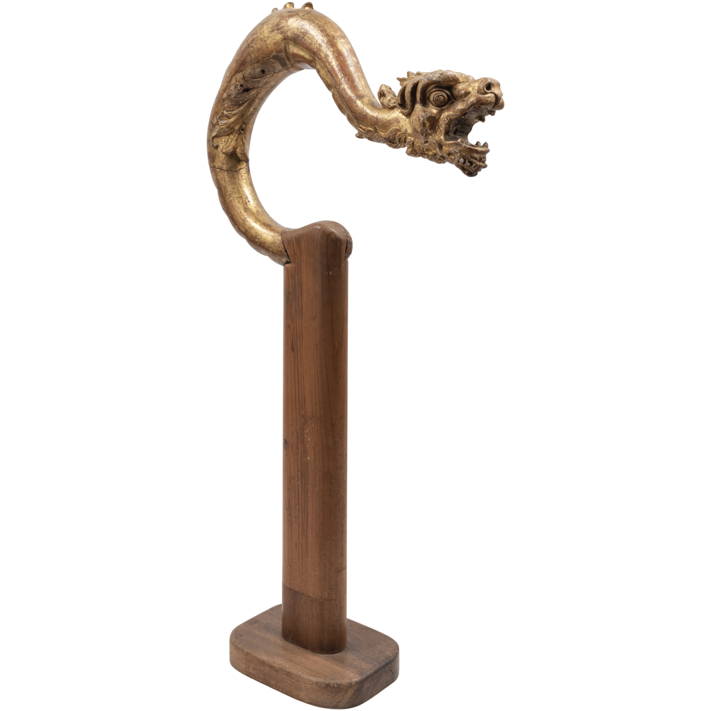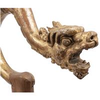 Talla en madera dorada a manera de cabeza de dragón montada sobre base de madera