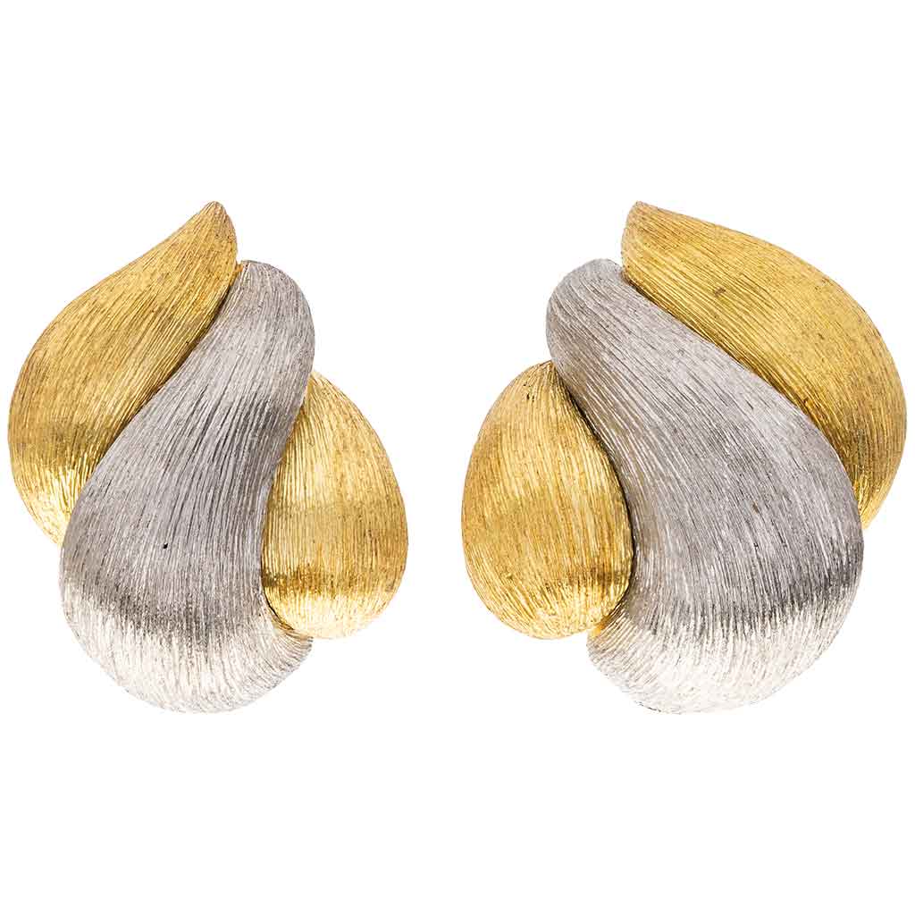 Subasta 1158, Lote # 116 PAR DE ARETES EN ORO AMARILLO Y BLANCO DE 18K Poste (uno corto y fuera del lugar) y raqueta (con protectores de silicón). Peso: 25.1 g. Tamaño: 2.4 x 1.9 cm aprox. Estimado $16,000-20,000