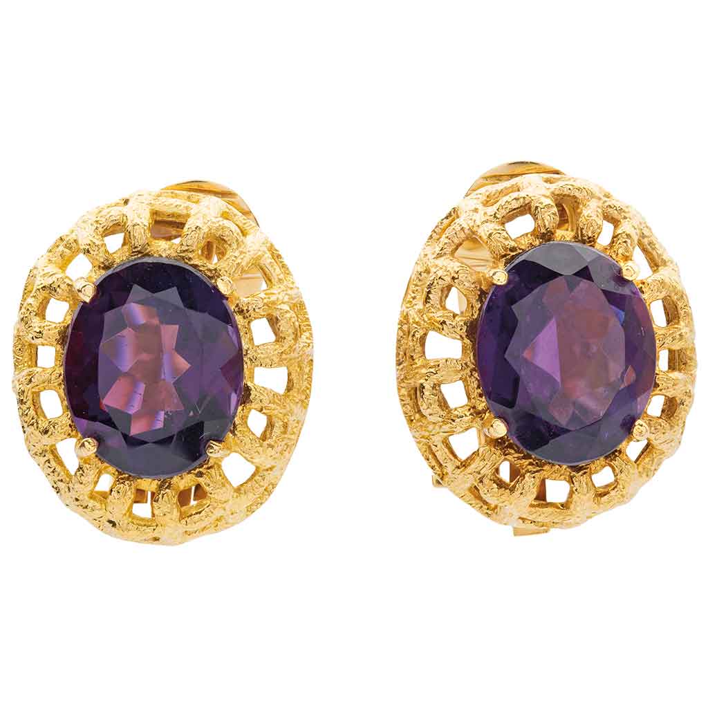 Subasta 1158, Lote # 138 PAR DE ARETES CON AMATISTAS EN ORO AMARILLO DE 18K Poste y raqueta (con protectores de silicón). Peso: 9.1 g. Tamaño: 1.8 x 1.5 cm aprox. Amatistas corte oval ~6.0 ct Estimado $8,000-10,000