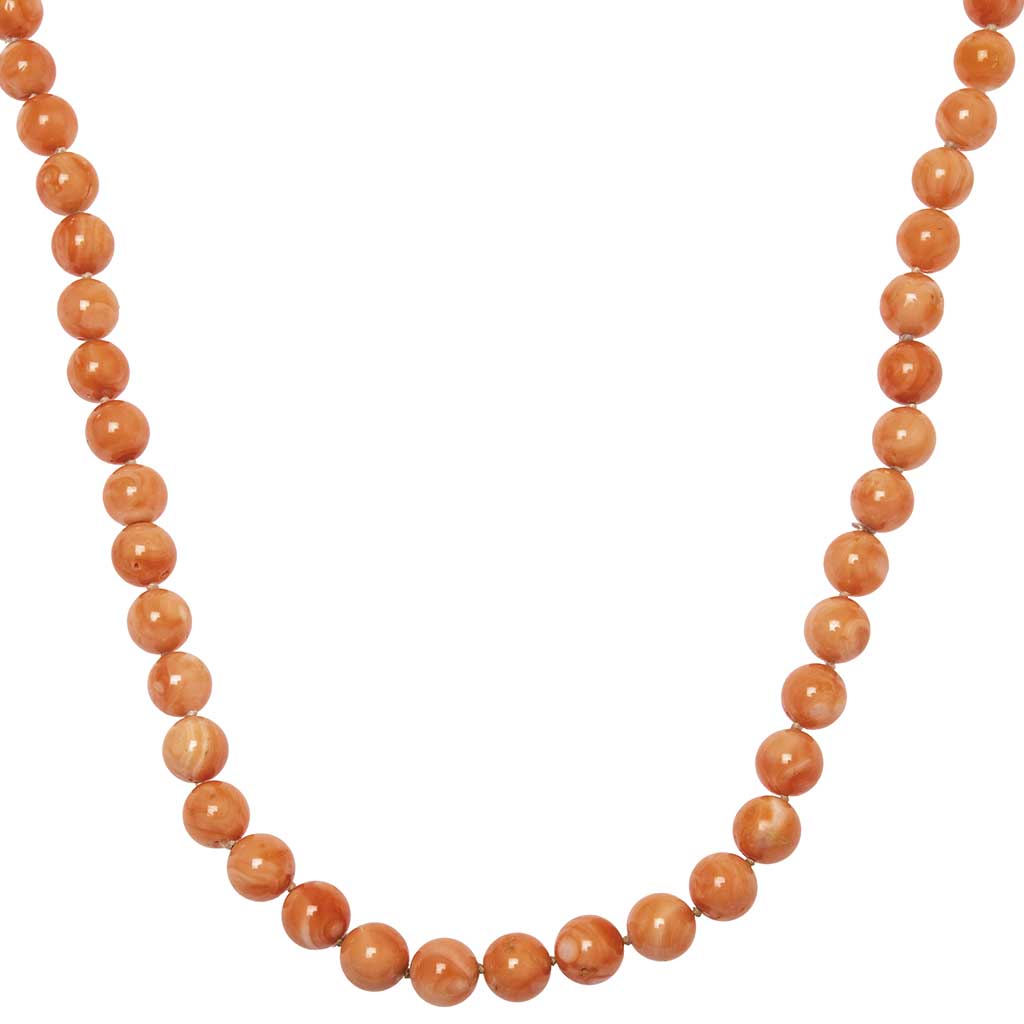 Subasta 1158, Lote # 137 COLLAR DE CORALES CON BROCHE EN ORO AMARILLO DE 14K Presenta reparaciones. Broche de anzuelo. Peso: 113.9 g. Largo: 85.0 cm aprox. Cuentas de corales color naranja: 9.6 - 10.7 mm aprox. Estimado $11,000-15,000