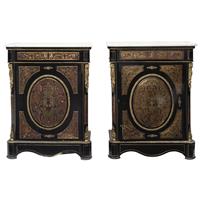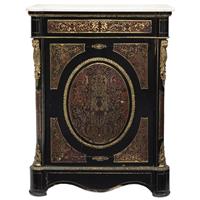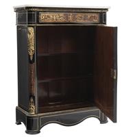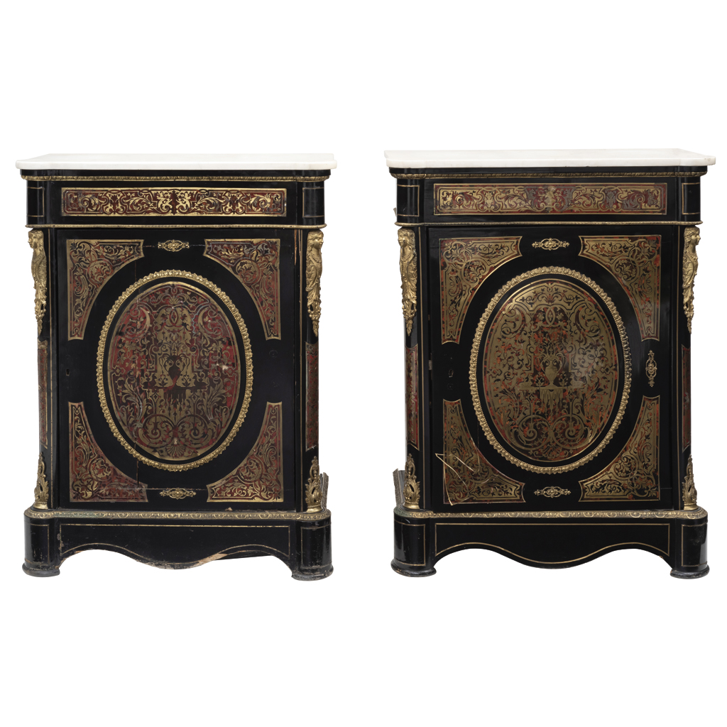 Elaboradas en madera laqueada con aplicaciones de bronce, pasta tipo carey y cubiertas de mármol blanco