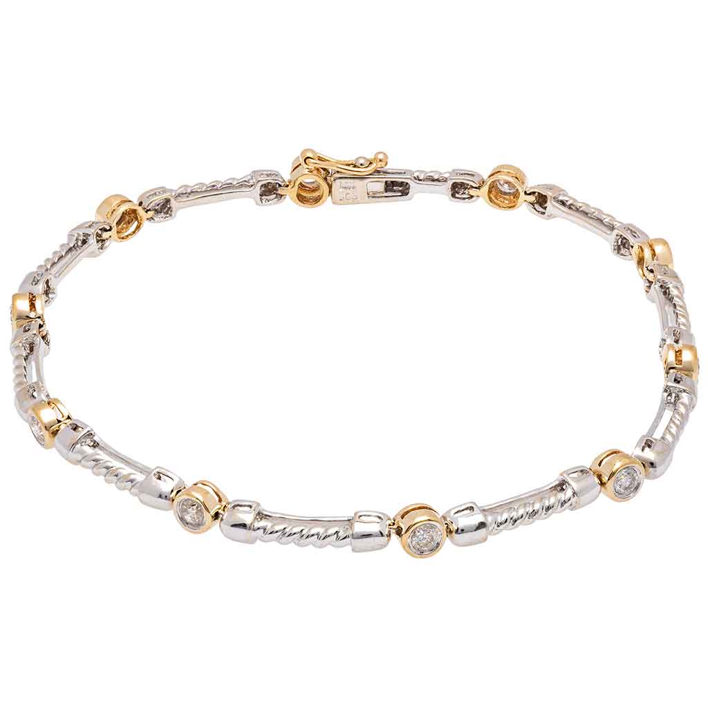 Subasta 1158, Lote # 189 PULSERA CON DIAMANTES EN ORO BLANCO 14K Con vistas amarillas. Broche de caja. Peso: 7.1 g. Largo: 17.5 cm aprox. Diamantes corte brillante ~0.35 ct (falta uno) Estimado $14,000-16,000