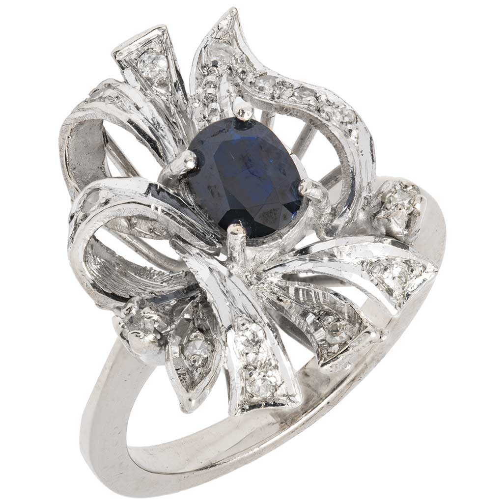 Subasta 1158, Lote # 196 ANILLO CON ZAFIRO Y DIAMANTES EN PLATA PALADIO Peso: 4.1 g. Talla: 5 3/4 1 Zafiro corte oval ~0.35 ct Diamantes corte 8x8 ~0.07 ct Estimado $4,000-5,000