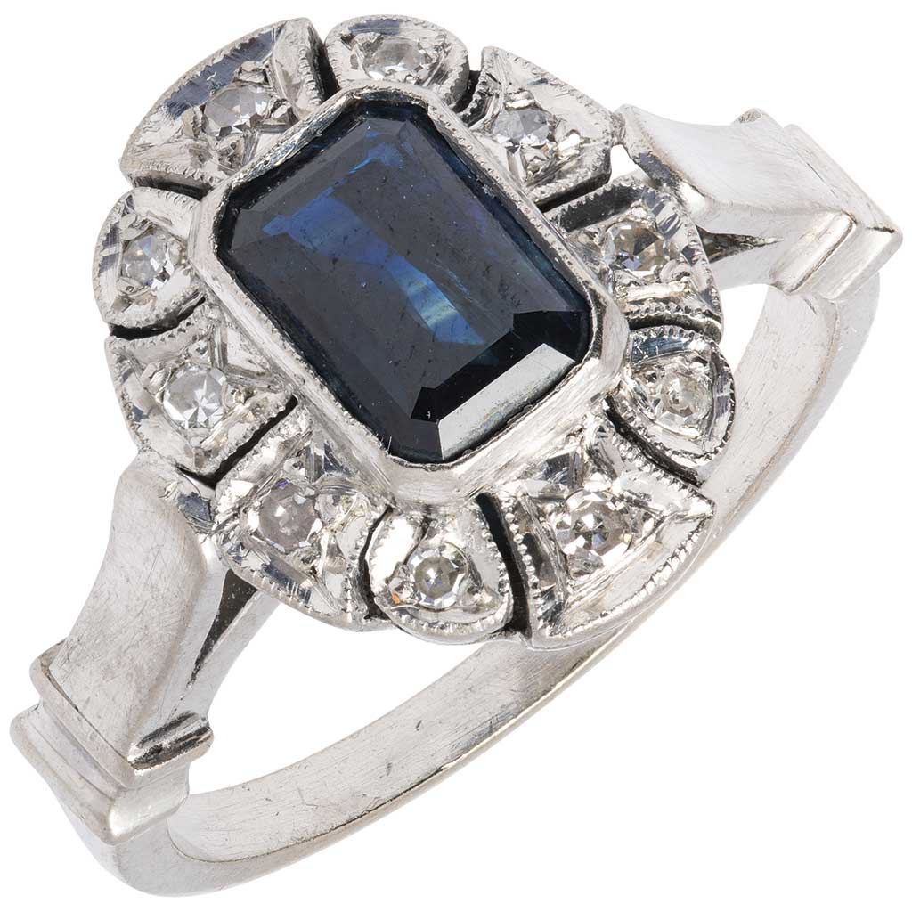 Subasta 1158, Lote # 171 ANILLO CON ZAFIRO Y DIAMANTES EN PLATA PALADIO Peso: 5.3 g. Talla: 8 1/2 1 Zafiro corte rectangular ~1.0 ct Diamantes corte 8x8 ~0.10 ct Estimado $5,000-6,000