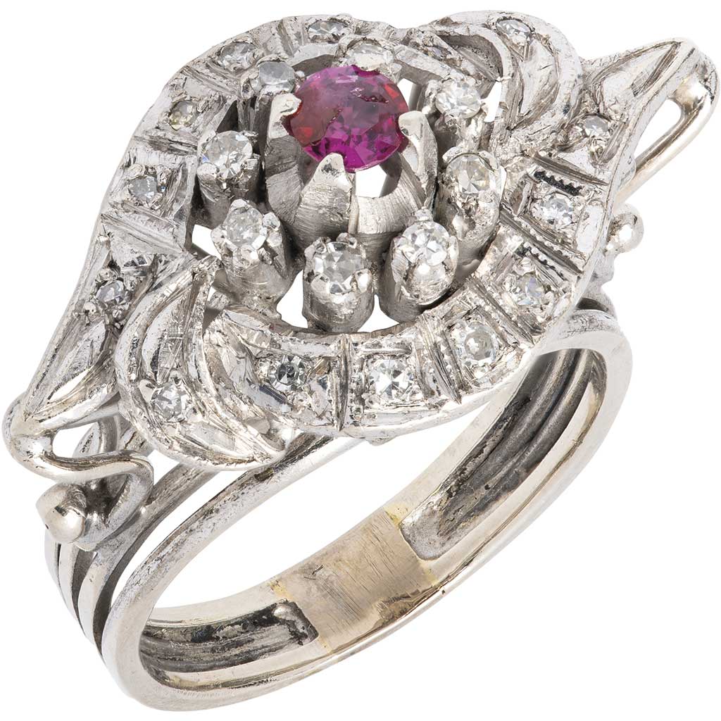 Subasta 1158, Lote # 169 ANILLO CON RUBÍ Y DIAMANTES EN PLATA PALADIO Peso: 5.5 g. Talla: 6 3/4 1 Rubí corte oval ~0.15 ct Diamantes corte 8x8 ~0.20 ct Estimado $5,000-6,000