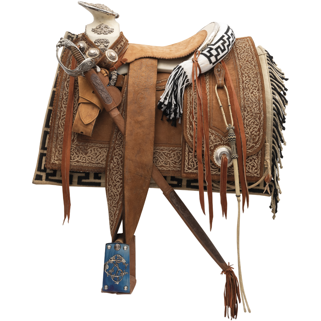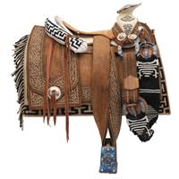 Incluye juego de mantilla, sarape, cuarta y cincho en tonos negro y hueso