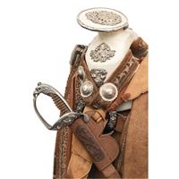 Cuenta con herraje de plata repujada y fuste decorado con aplicaciones de plata