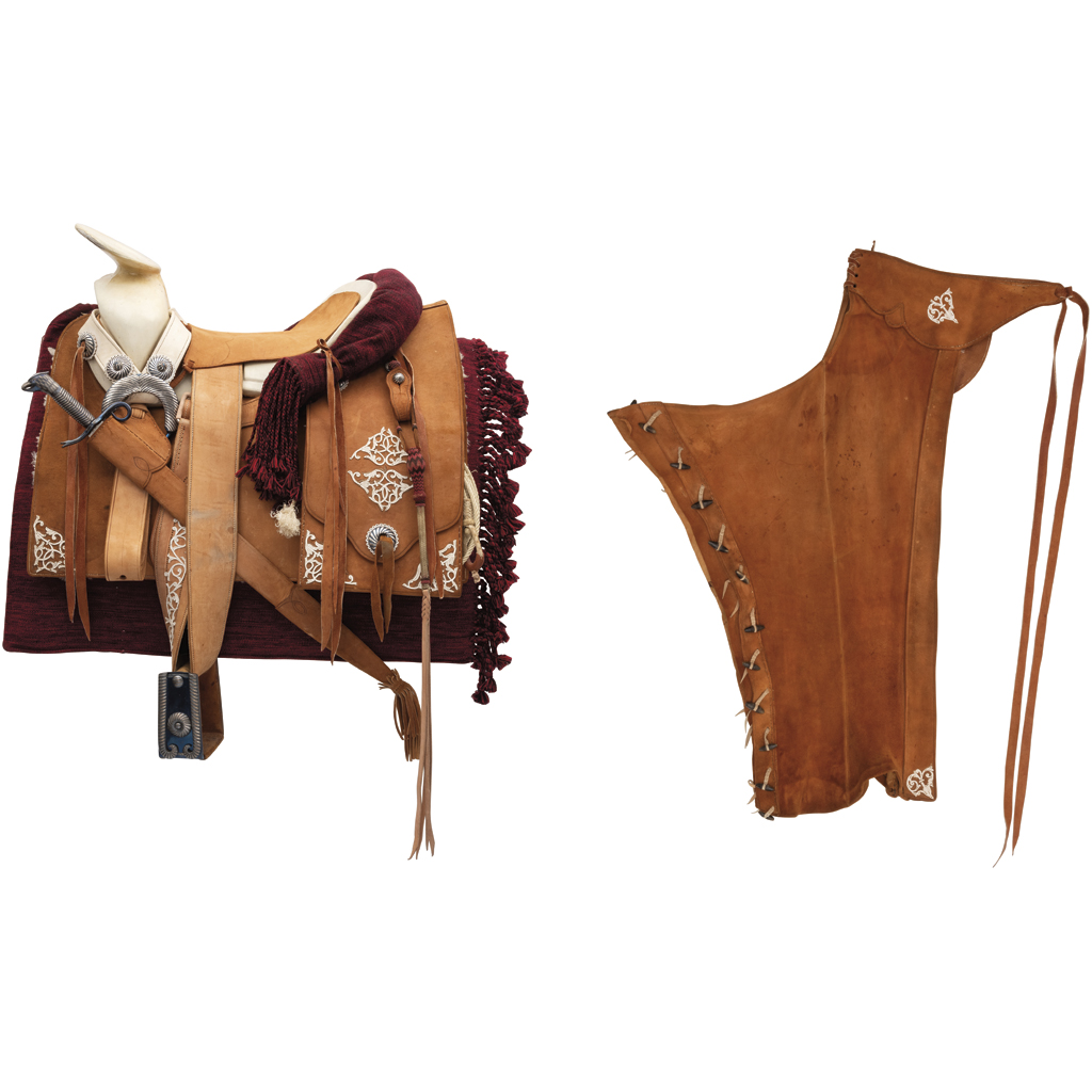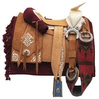 Juego completo de silla de cantinas cuadradas con chaparreras en cuero invertido y acabado de gamuza en color yesca, con enrriatados y remates de pial calado y respunteado