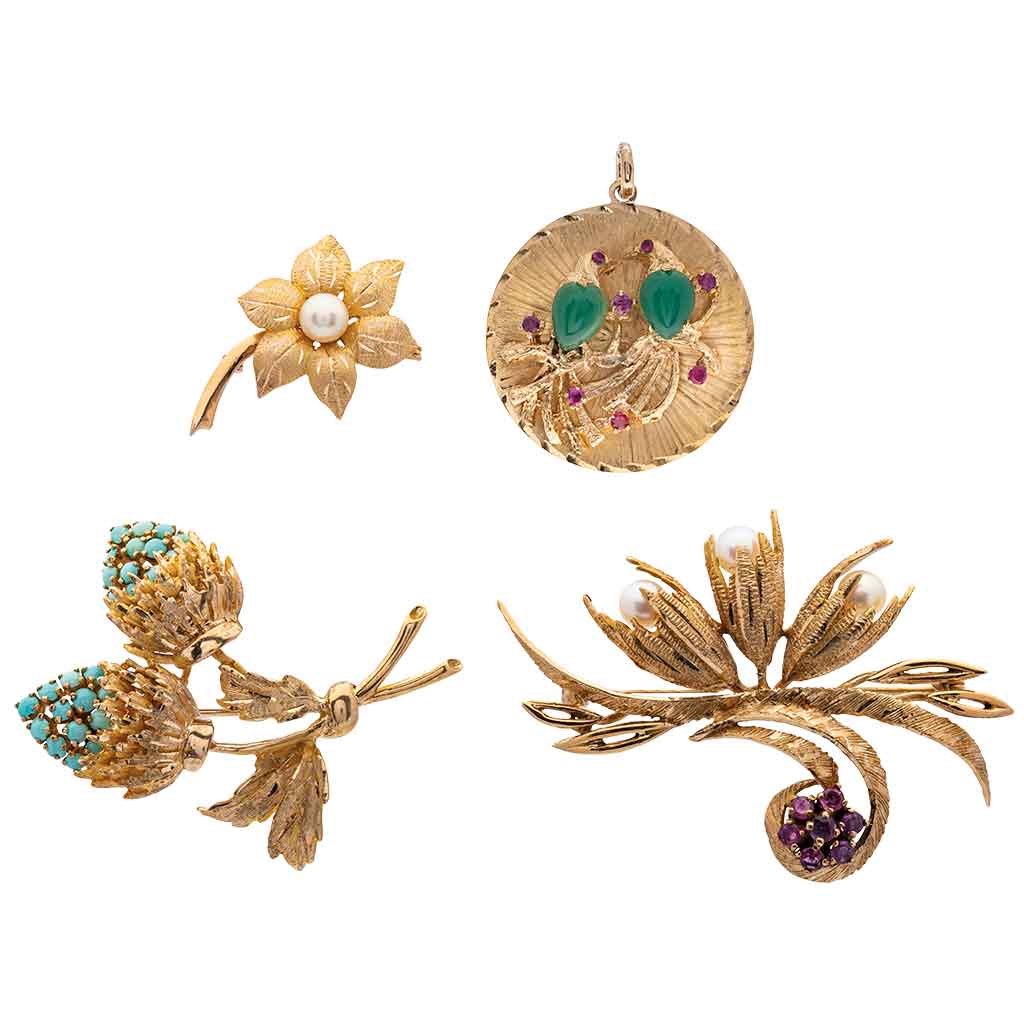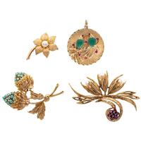 PENDIENTE Y TRES PRENDEDORES CON PERLAS Y SIMULANTES EN ORO AMARILLO DE 14K