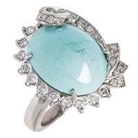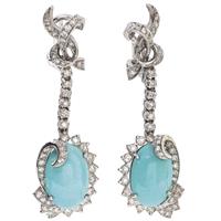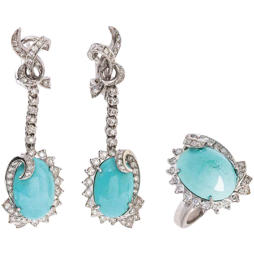 JUEGO DE ANILLO Y PAR DE ARETES CON TURQUESAS Y DIAMANTES EN PLATA PALADIO