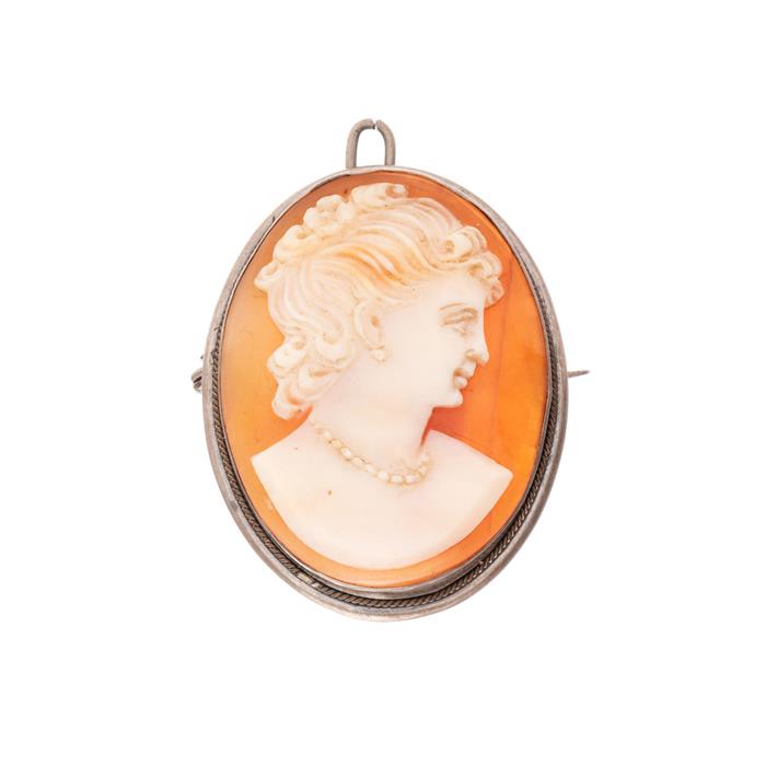 Subasta 1243T, Lote # 336 Pendiente prendedor con camafeo. Imagen de dama. Bisel en plata ley .800. Peso: 7.4 g. Estimado $600-1,500
