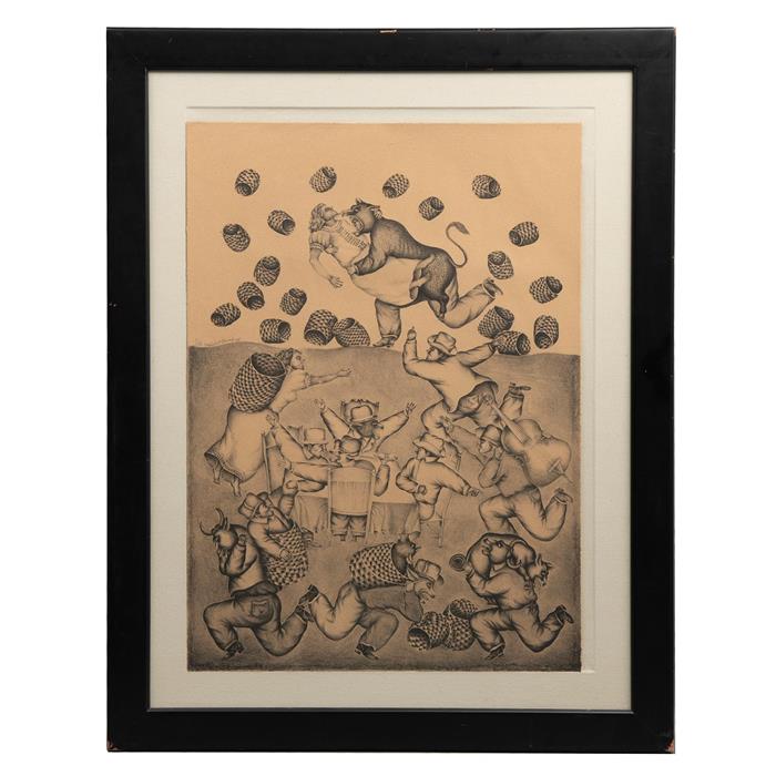 MAXIMINO JAVIER (Santa Fe la Mar, Valle Nacional, Oaxaca, 1948 - ) Hombres y toros Firmada Litografía 1 / 12 Enmarcada. 65 x 50 cmEstimado $9,000-15,000