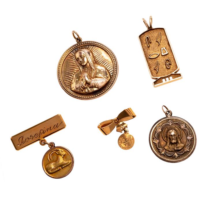 Dos medallas, 2 prendedores con dijes zodiacales y 1 pendiente en oro amarillo 8k, 14k y 18k.