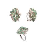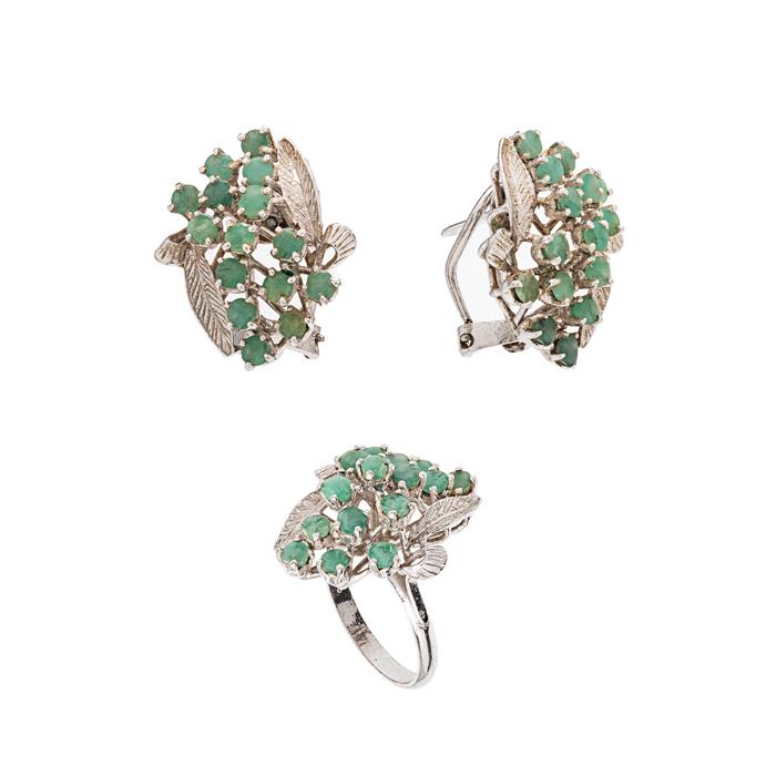 Anillo y par de aretes vintage con esmeraldas en plata .720.