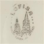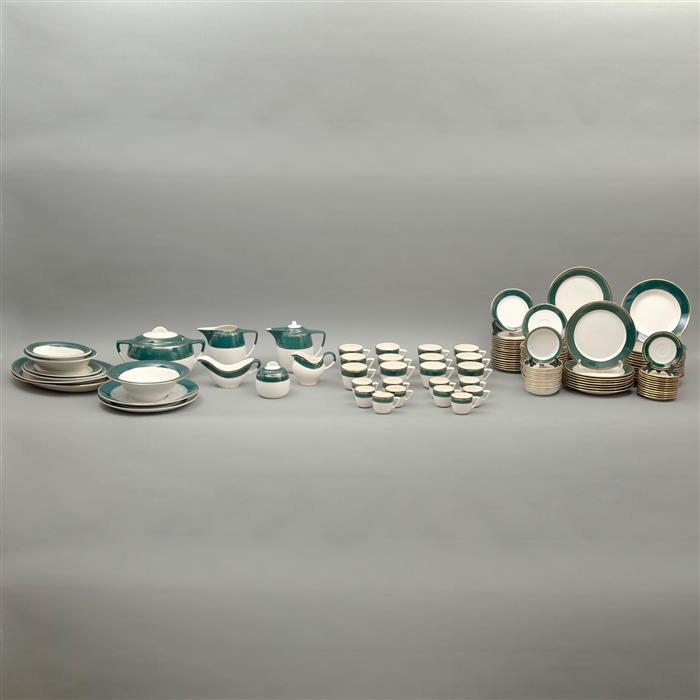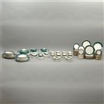 Consta de sopera, salsera, tetera, jarra, azucarera, 8 platos de servicio, 12 tazas, 14 platos terno, 10 tazas de té, 12 platos terno, 12 platos dulce, 16 platos pan, 11 platos ensalada,12 platos sopero y 23 platos trinche