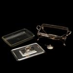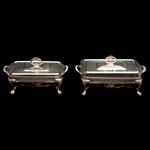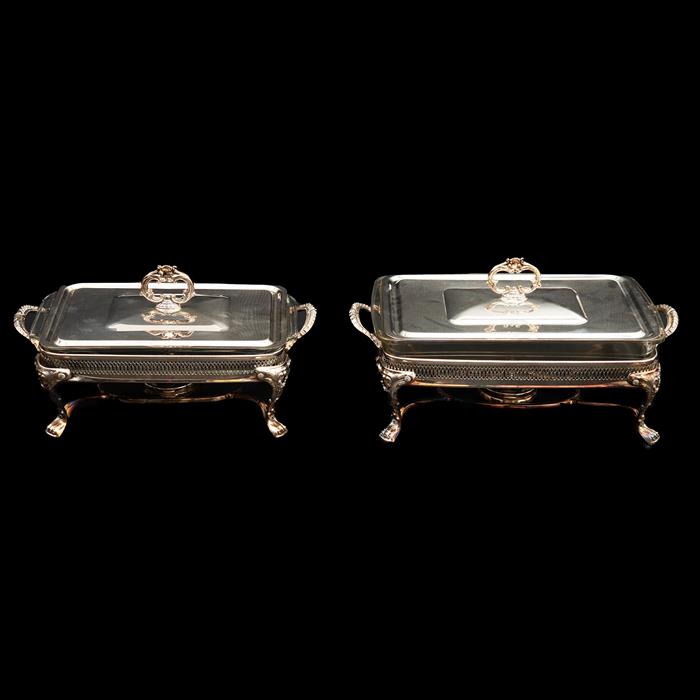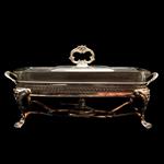 Metal plateado, soportes a manera de garra, relieves de acantos y borde calado; cuentan con refractario de vidrio transparente, tapa y quemador
