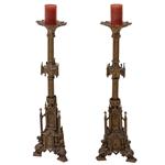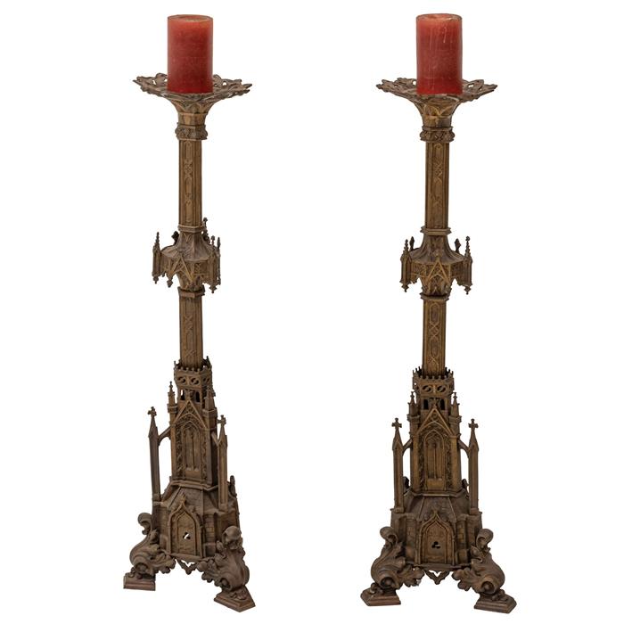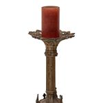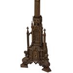 Bronce, acabado oro viejo; soporte trípode, fuste profusamente decorado con relieves arquitectónicos de estilo gótico