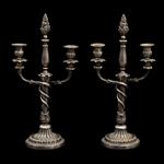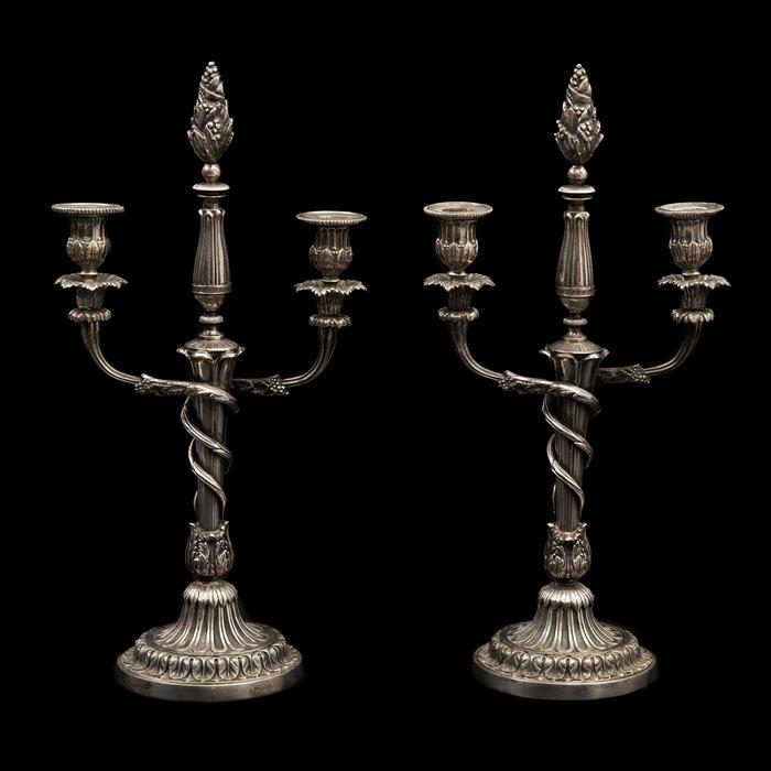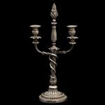 Metal plateado, estilo ART DECO, para dos luces; base redonda, fuste de diseño compuesto, relieves con figuras de tipo vegetal