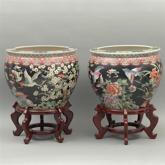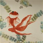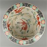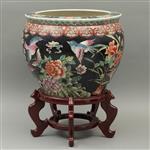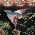 Decoración floral, aves sobre fondo negro y peces al interior