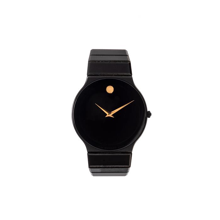 Subasta 1245T, Lote # 349 Reloj Movado. Movimiento de cuarzo. Caja circular en acero recubrimiento en color negro. Carátula color negro. Pulso en acero color negro. Estimado $3,500-4,000