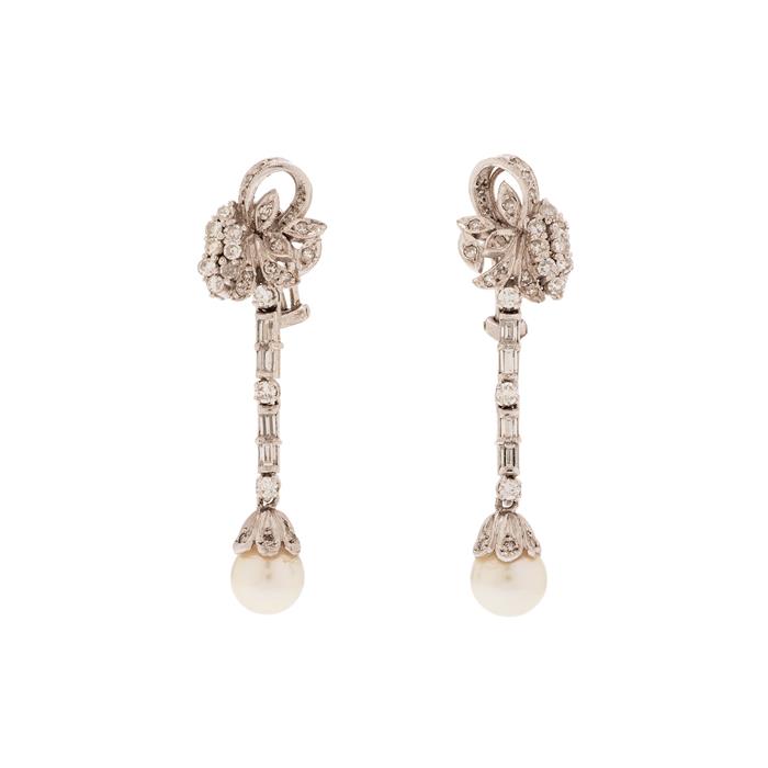 Subasta 1248T, Lote # 332 Par de aretes vintage con perlas y diamantes en plata paladio. 2 perlas color blanco de 8 mm. 31 diamantes corte baguette y 8 x 8. Peso: 16.2 g. Estimado $8,000-15,000